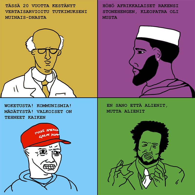 Muinaiset tummaihoiset metsästäjä-keräilijät olivat eurooppalaisia, eivät afrikkalaisia. Ja siltikin arvovaltainen BBC tuotti populaarin “Been Here From the Start” -videon, jossa kerrotaan modernien afrikkalaisten olleen täällä koko ajan. Tämä on toki vain yksi esimerkki. Mediassa harjoitettu mustapesu on herättänyt kiivasta vastustusta, ja näen sen olevan myös osasyy siihen, miksi paleoliittisten metsästäjä-keräilijöiden ihonväristä on vaikea keskustella enää neutraalisti.