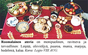Rahvas ei useinkaan näe lihaa ruokapöydässään kuin pyhinä, jolloin papit tarjoilevat uhrilihaa kaikille. Muuten mässäily on keskiluokan ja ylimystön ilo. Lukemattomat eri kalalajit, linnut ja muut eläimet valmistetaan yleensä keitettynä, paistettuna parilalla tai haudutettuna pataruokana runsaiden kastikkeiden kera. Roomalainen yleiskastike ja mauste jota laitetaan lähes joka ruokaan on garum, ihmeellinen kalakastike, jota on tarjolla yleensä laaja kirjo arkisesta käyttömausteliemestä aina huippukalliseen valkeasta mureenanlihasta valmistettuun maitomaiseen lac murenaeen. Toinen ehdoton suosikki on hapanimeläkastike.