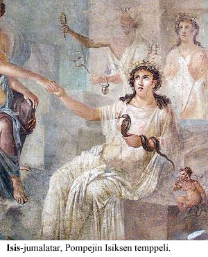 Kymmentuhatniminen Isis, hänen lapsensa Horus (Harpocrates) ja Serapis muodostavat egyptiläisen pyhän kolminaisuuden. Isis suojelee vaaroilta ja paljastaa jälleensyntymän mysteerin; hän on erityisen suosittu merenkävijöiden keskuudessa. Isiksen kulttimenot Roomassa ovat eroottisuudensa vuoksi pysyvien juorujen aihe. Isis on monin paikoin sulauttanut itseensä Venuksen, Demeterin, Kybelen ja Cereen kultit.