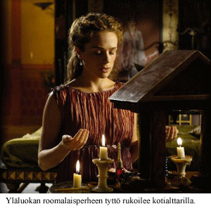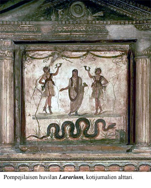 Jokainen ihminen kuuluu elämänsä aikana useaan kulttiyhteisöön, joiden kautta jumalia palvellaan. Pienin kulttiyhteisö on perhe, johon roomalaisittain kuuluvat myös orjat. Sen pappi on perheen pää, paterfamilias. Jokaisella perheellä on omat daemoninsa huolehdittavanaan. Kodista ja viljakellareista pitävät huolen laarit (lares), kodinhenget, joita symbolisoivat kotialttariin (lararium) kuvatut käärmeet. Laarit suojelevat koko perhettä ja sen orjia, ja ovat tekemisissä myös esi-isien henkien kanssa.