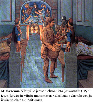 Mithralaiset kutsuvat toisiaan veljiksi (sodales) ja pappejaan isiksi (pater). He uskovat, että maanpäällinen elämä on taistelua taivaan ja helvetin voimien välillä. Vedellä ja härän verellä tehtävä kaste ja Mithran pyhä sotilasvala (sacramentum) yhdistävät uskovat legioonaksi joka taistelee Mithran rinnalla pimeyden voimia vastaan. Kaikki muut ovat siviilejä (pagani). Vuoden tärkein juhla on Mithran syntymäpäivä 25. joulukuuta (dies natalis solis invicti). Sen lisäksi mithralaiset pyhittävät sunnuntain sekä jokaisen kuun 16. päivän. Silloin veljet rukoilevat Mithraa neljä kertaa päivässä neljään eri ilmansuuntaan, auringon aseman mukaan. Uskovaisten kokouspaikat, mithraeumit, on rakennettu maan alle muistuttamaan luolaa, Mithran syntymän, kuoleman ja uudelleensyntymän paikkaa.