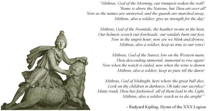 Mithras on syntynyt maailman aamuna ja elää kunnes viimeinenkin tähti on pudonnut taivaalta. Hän on jokainen mies ja ei mies lainkaan. Hän on kaikkivaltias ja pelastaja, kukistamaton, kosmoksen hallitsija (kosmokrator), taivaan piirien liikuttaja. Jumala joka syntyi ihmiseksi talvipäivänseisauksena, sikisi neitseellisesti kivestä maanalaisessa luolassa. Mithras vaelsi kaikkiin maan ääriin ja opetti ihmiskunnalle itsensä hallitsemista, paransi sairaita ja suoritti ihmetekoja. Hänen opetuslapsensa täydellistivät hänen opettamansa eettisen järjestelmän ja todistivat herransa laskeutumisen manalaan ja ylösnousemuksen taivaaseen.