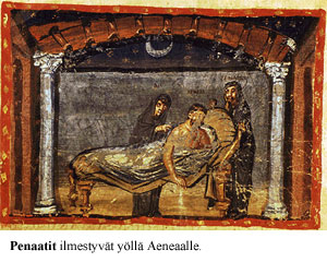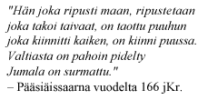 "Eikä, kun viimein on elo jättänyt, pois mene noista kurjista kokonaan paha, ei lähde ruumiin raadollisuus, vaan säilyy se heissä ja, kumma, pitkään piintynyt on moni turmelus kasvanut kiinni. Niinpä he nyt kärsivät pahan rangaistusta ja täällä maksavat synneistään. On osa ripustettuna tyhjiin tuuliin, toisien taas saa saastaa huuhtoa suuri virtain syöveri tai rikosten töhryn pois tuli polttaa." – Vergilius (suom. Alpo Rönty)