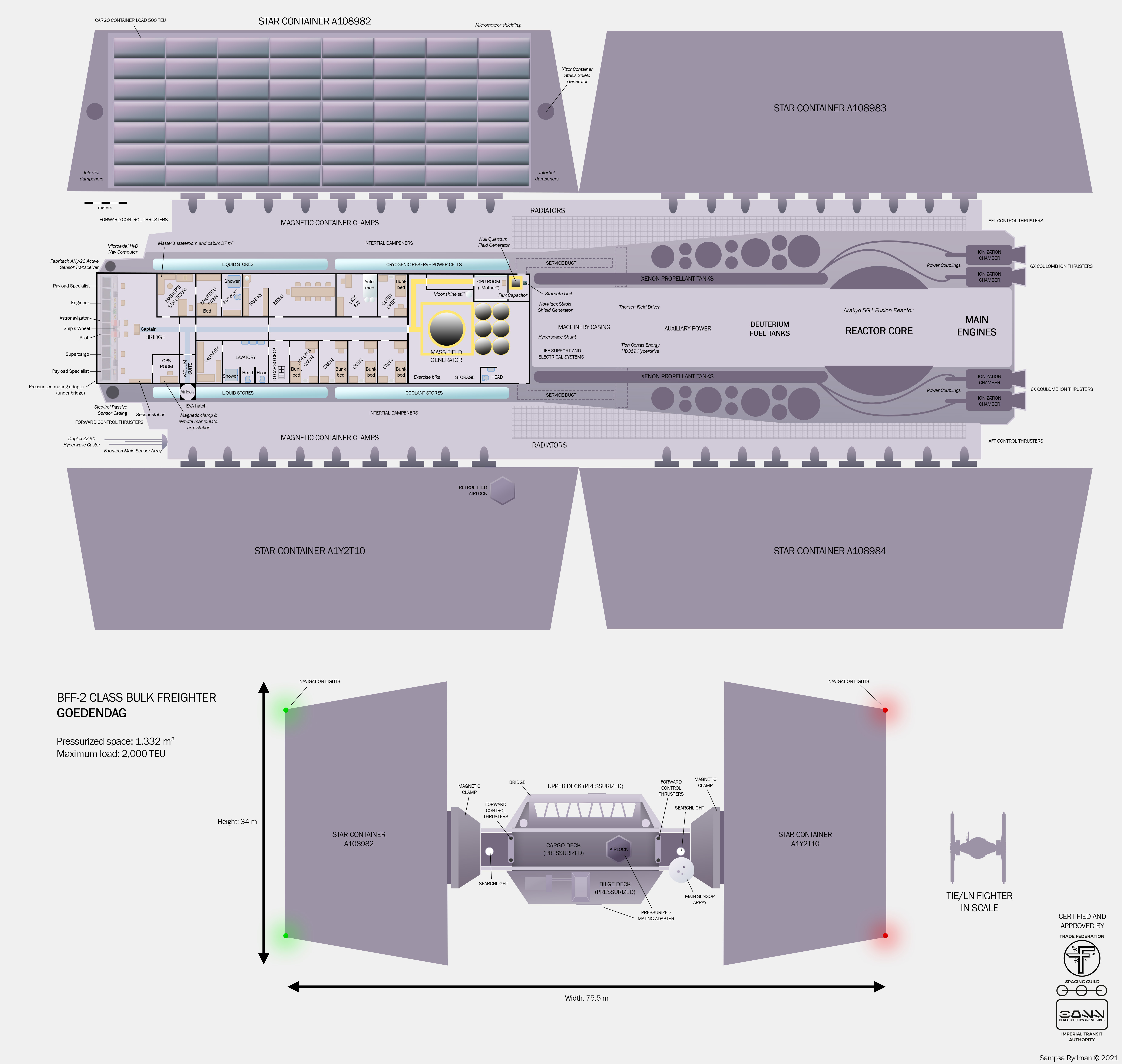 Jalkapallokentän kokoinen BFF-2 -luokan konttialus kuljettaa 6-kerroksisen kerrostalon kokoisia A-tyypin tähtikontteja (19 x 34 x 60 metriä). Kts. tarkempi pohjakaava täältä.
