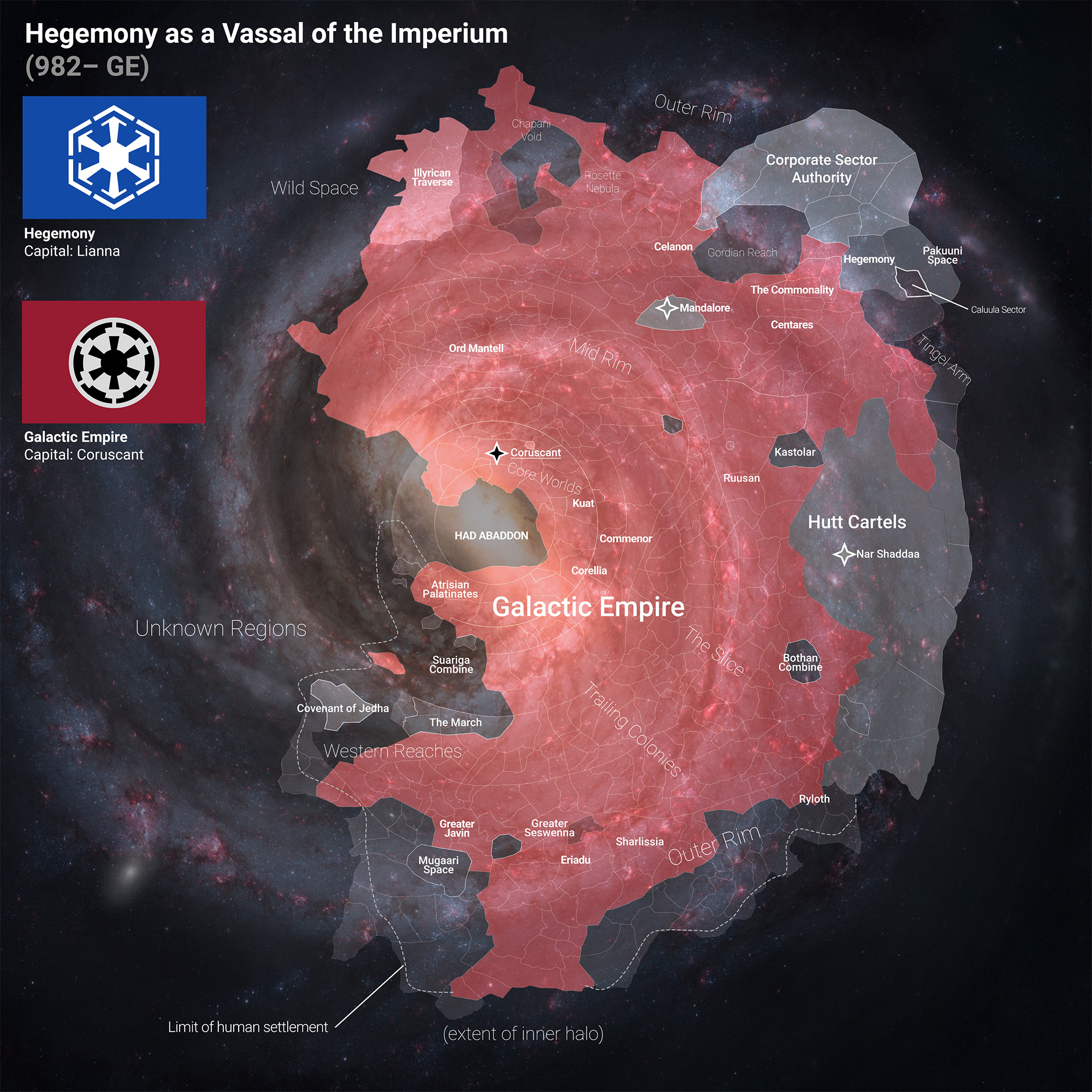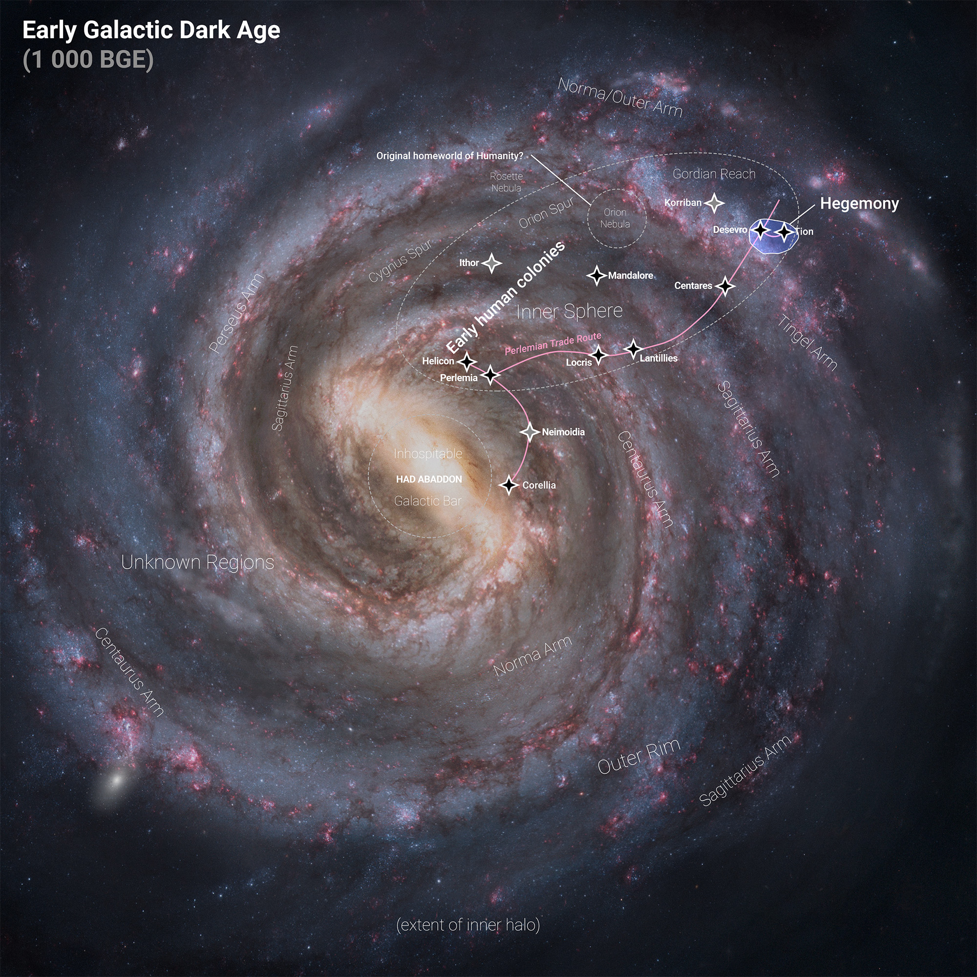 Linnunradan ulkokehällä on joukko vanhoja ihmisten siirtokuntia, joilla on takanaan loistava menneisyys. Aikoinaan ne muodostavat Linnunradan ensimmäisen supervallan, Hegemonian, jonka asukkaat olivat tähtienvälisiä kauppiaita, tiedemiehiä ja sotilaita. Nykyään Hegemonia on galaktinen Balkan: Fragmentoitunut, feodaalinen, konservatiivinen, nurkkakuntainen ja taloudellisesti taantunut takapajula. Se on alisteinen paljon suuremmalle Galaktiselle Imperiumille, jonka ylivoimainen sotilaallinen mahti kontrolloi tähtienvälisiä kulkuteitä ja rahan arvoa. Joukko Hegemoniasta itsenäistyneitä itsenäisiä valtioita kamppailee keskenään samoista luonnonvaroista. Imperiumin ote Ulkoreunalla on etäinen ja heikko. Kaikki valtiot ovat riippuvaisia vapaista kauppiaista ja killoista, jotka kuljettavat rahtia maailmojen välillä. Rahtikuljetukset ovat hyvin tuottoisia sekä kauppiaille itselleen että killalle, johon kauppiaiden on pakko kuulua. Fortis fortuna adiuvat. |
