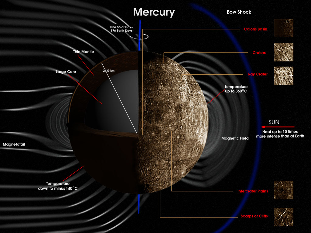 Merkurius on Aurinkoa lähin planeetta ja aurinkokunnan tihein kappale. Se on nimetty roomalaisten varkaiden ja kauppiaiden jumalan Merkuriuksen mukaan. Planeetta pyörii hitaasti: Pyörähdysajan ja kiertoajan suhde on 2:3. Lämpötila Merkuriuksen pinnalla vaihtelee satoja asteita sen mukaan, ollaanko planeetan päivä- vai yöpuolella. Merkuriuksen akselikallistuma on vain 0,01 astetta, joten sen navoilla on varjoisia jään täyttämiä kraatereita, jonne aurinko ei koskaan paista.