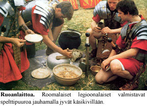 Perusruoka on vedestä ja rouhituista jyvistä hauduttamalla valmistettu puuro (puls), joka syödään yleensä runsaan kastikkeen ja kypsennettyn vihannes- tai kalahöystön kera. Leipiä myydään noin kolmeakymmentä eri laatua. Yleisin ja halvin on pyöreä, tähtimäisen päälliskuvionsa vuoksi helposti murtamalla tasakokoisiin lohkoihin jaettava hiivaleipä. Yhtä yleisiä ovat vuokaleivät ja rieskat. Maukkaita ja arvostettuja leipälaatuja ovat vaalea mallaslimppu (panis Picentinus) ja oliivi- ja yrttitäytteinen aleksandrianleipä (panis Alexandrinus).