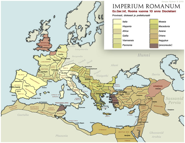 Diocletianuksen uuden järjestyksen mukaan valtakunta on jaettu uudelleen lähes sataan keisarillisten virkamiesten hallitsemaan provinssiin, jotka muodostavat isompia vikaarien (vicarius, viransijainen) hallitsemia diokeeseja.