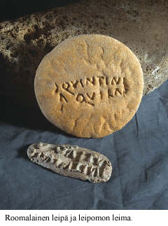 Perusruoka on vedestä ja rouhituista jyvistä hauduttamalla valmistettu puuro (puls), joka syödään yleensä runsaan kastikkeen ja kypsennettyn vihannes- tai kalahöystön kera. Leipiä myydään noin kolmeakymmentä eri laatua. Yleisin ja halvin on pyöreä, tähtimäisen päälliskuvionsa vuoksi helposti murtamalla tasakokoisiin lohkoihin jaettava hiivaleipä. Yhtä yleisiä ovat vuokaleivät ja rieskat. Maukkaita ja arvostettuja leipälaatuja ovat vaalea mallaslimppu (panis Picentinus) ja oliivi- ja yrttitäytteinen aleksandrianleipä (panis Alexandrinus).