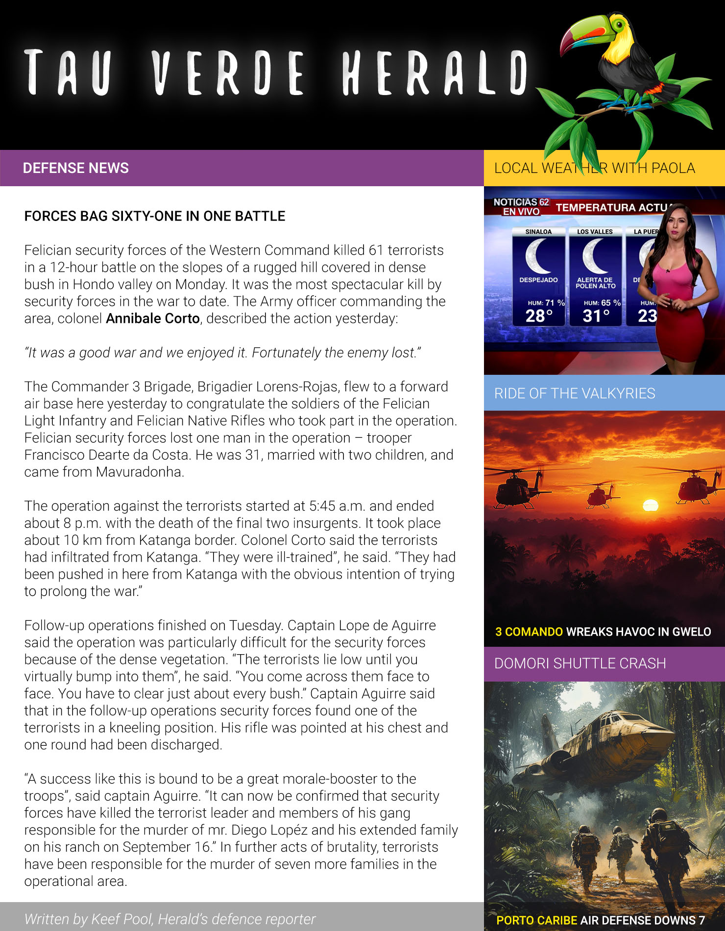 Tau Verden tasavallan hallussaan pitämä alue on viiteen sotilaspiiriin. Taistelussa lukumääräisesti ylivoimaisia kapinallisia vastaan Tau Verden armeija tukeutuu omiin vahvuuksiinsa: liikkuvuuteen, tulivoimaan ja koulutukseen. Armeija ei pysty yhtäaikaisesti puolustamaan koko harvaan asuttua maata, mutta nopeasti paikasta toiseen liikkuvat ilmarynnäkköjoukot partioivat rajaseutuja yhteistyössä paikallisten ratsutiedustelijoiden ja kodinturvajoukkojen kanssa.