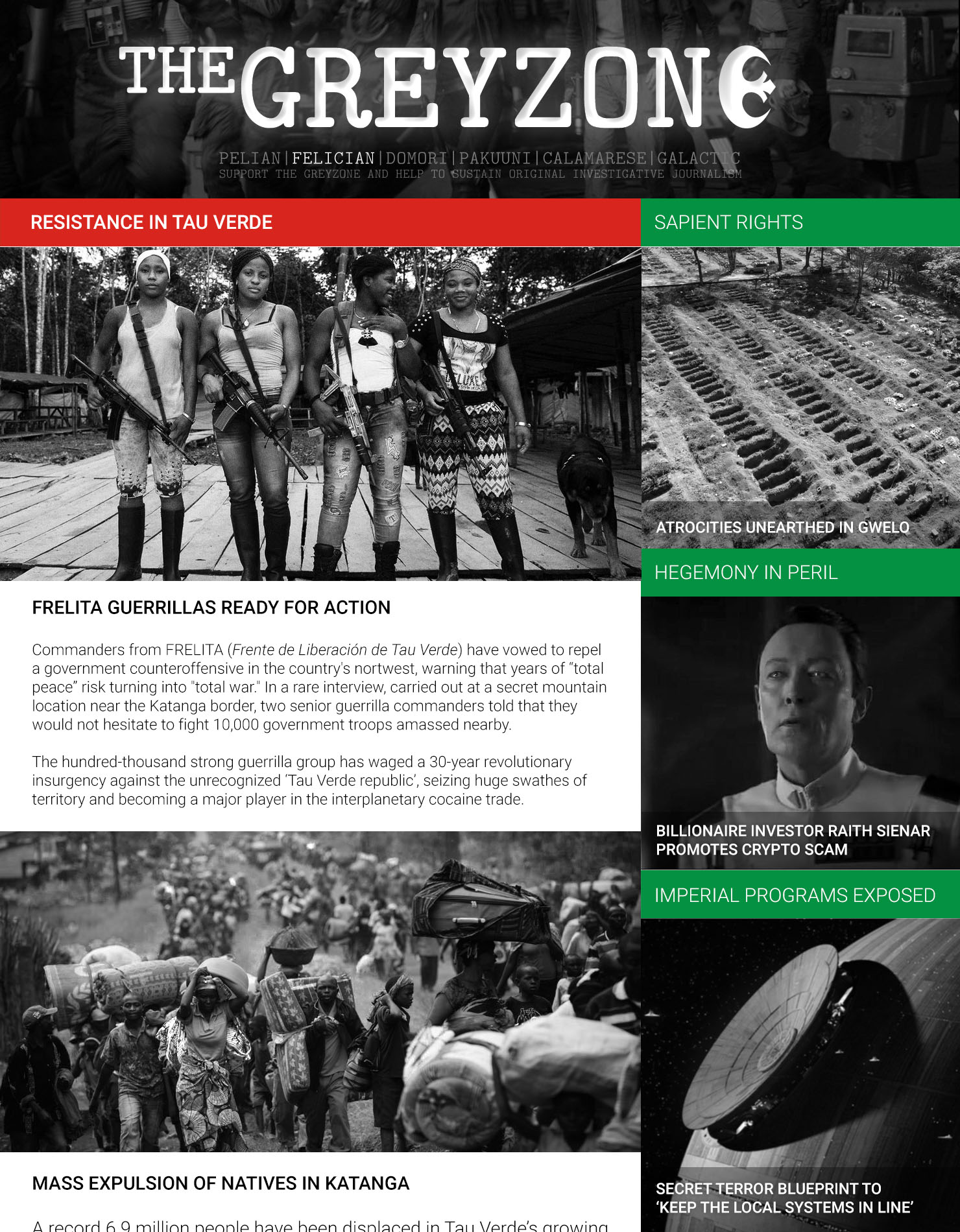 Tau Verden tasavaltaa vastaan taistelee kolme suurta kapinaliikettä. FRELITA (Frente de liberación de Tau Verde) eli Tau Verden vapautusrintama on Selukwesta käsin toimiva, Domorin kansan-kongressin rahoittama ryhmittymä, jolla on yli 100 000 aktiivista taistelijaa ja miljoonia kannattajia. Sen kanssa kilpailee vallankumouksellien ääriliike FARK (Fuerzas Armadas Revolucionarias de Katanga), joka saa tukea muilta tähtienvälisiltä vallankumousliikkeiltä.
